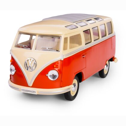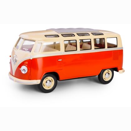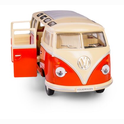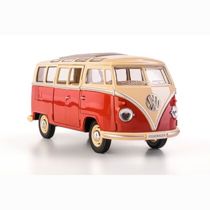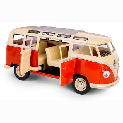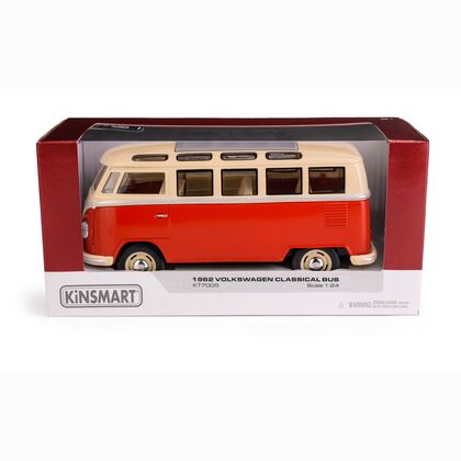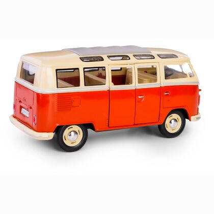 Metalowy model kolekcjonerski 1962 Volkswagen Classical Bus w skali 1:24 z funkcją pull-back. Produkt wykonany z wysokiej jakości metalu i tworzywa sztucznego, z otwieranymi drzwiami i gumowymi oponami. Zaprojektowany z dbałością o detale, idealny zarówno jako zabawka dla dzieci powyżej 3 roku życia, jak i gadżet kolekcjonerski.